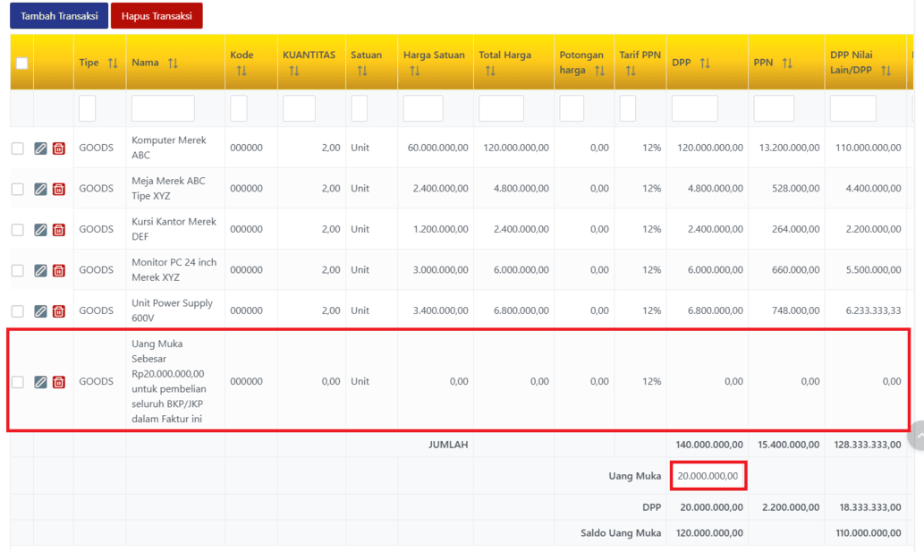 - Pada kolom Uang Muka, masukkan 11/12 dari nilai uang muka yang diterima.